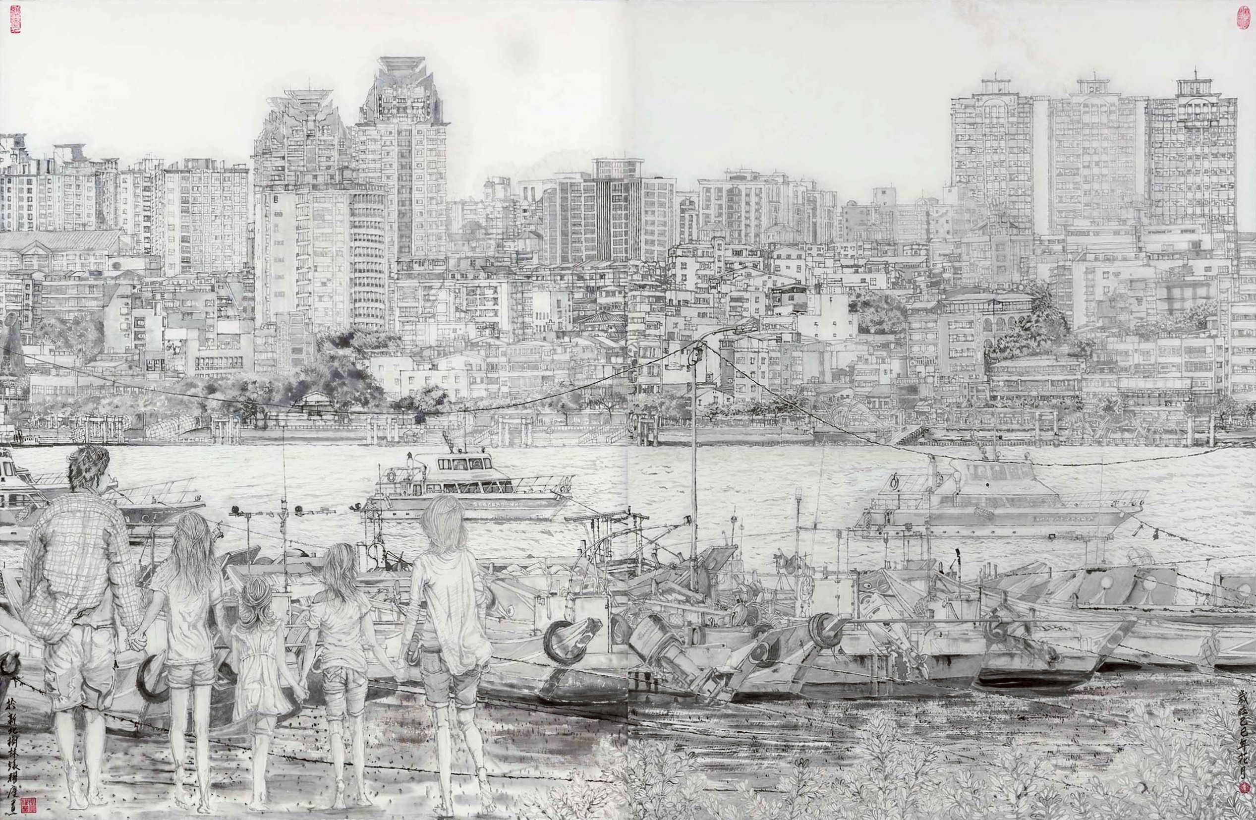 張耀慶は「一河両岸」という構図を用い、美しい柔らかな印象を持つメゾチント版画風の 繊細な黒白線描を用い、淡水河両沿いの繁華な街並み及び整然と並ぶ漁船を描き出しています。画面は階調が明瞭で物語性に溢れ、恰も現代版の『清明上河図』を彷彿とさせます。画面は張力及び躍動感を兼ね備え、斬新さが感じられ、正に現代水墨画の傑作と呼ぶに相応しいものです。