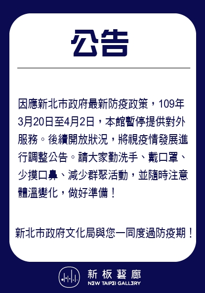 因應新北市政府防疫政策, 新北市文化局所設藝文場館目前取消預約制, 請留意館舍持續更新之最新訊息。 新北市政府文化局與您一同度過防疫期!