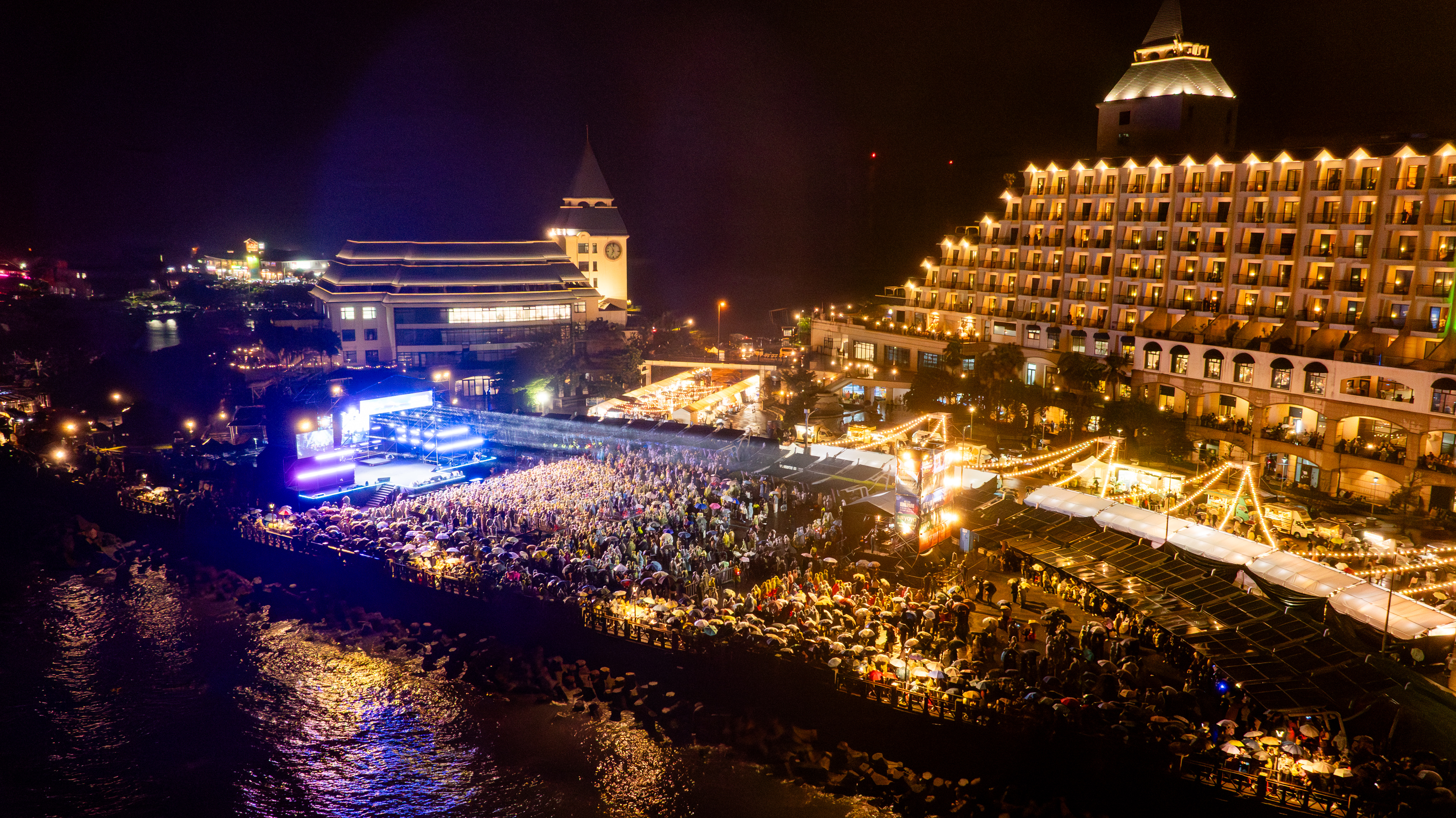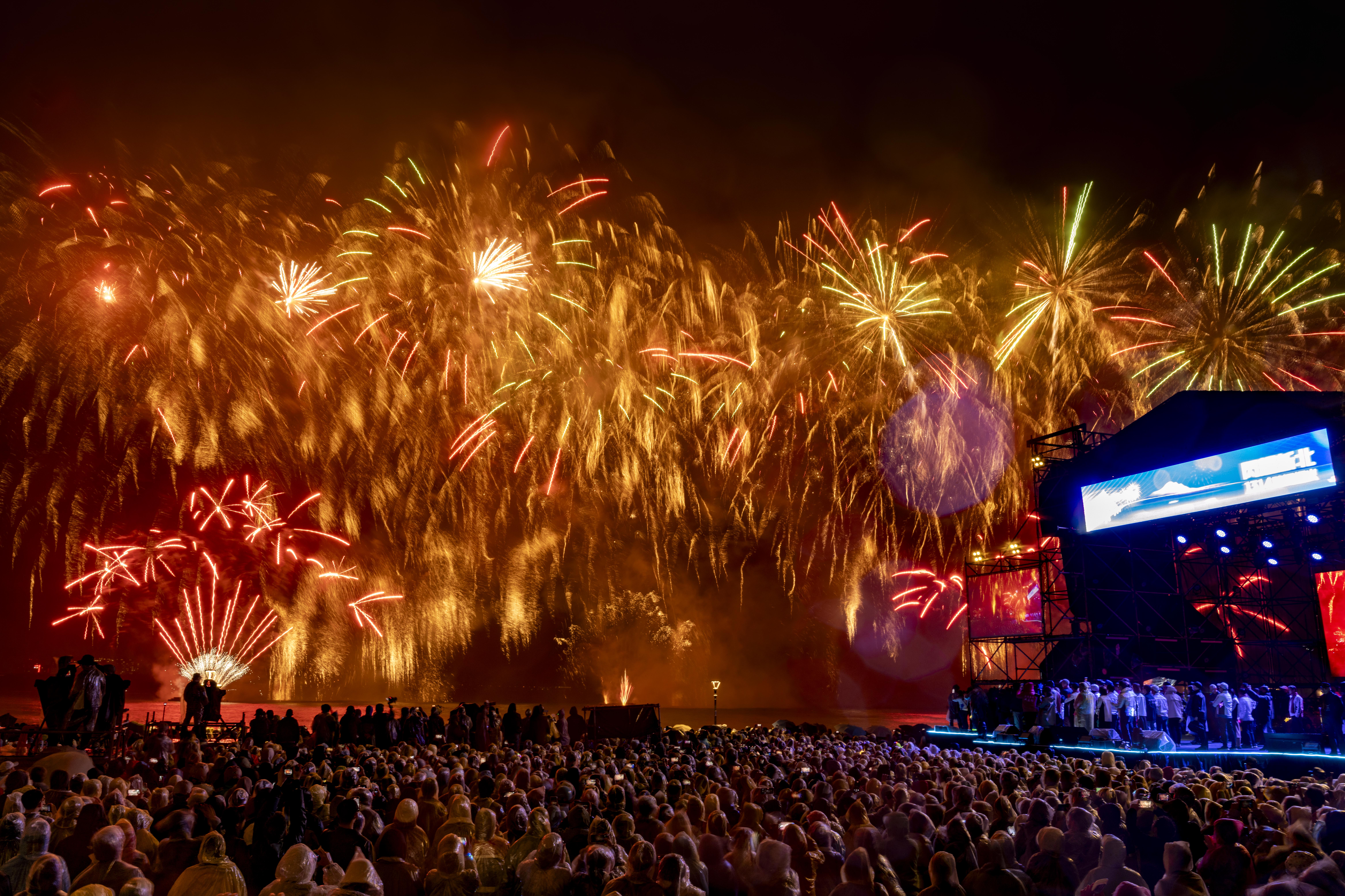 其中,金曲歌王蕭煌奇攜手全方位樂團,以〈一定要成功〉凝聚現場能量,接續演唱〈好好先生〉、〈沒那麼簡單〉等膾炙人口的經典歌曲,溫暖歌聲引起全場共鳴。蕭煌奇更與淡水在地藝人李炳輝,同台合唱新歌〈輝煌旅行社〉及〈流浪到淡水〉,呼應跨河煙火舉辦地點「淡水星光舞台」,也讓音樂與土地情感緊密交織;壓軸登場的韓國人氣天后 hwasa,則以舞台魅力震撼全場,一現身便引爆觀眾歡呼聲。hwasa 帶來新歌〈good goodbye〉,低沉而富有張力的嗓音,搭配極具力量感的舞台演繹,魅力四射的國際級演出,現場尖叫聲不斷。